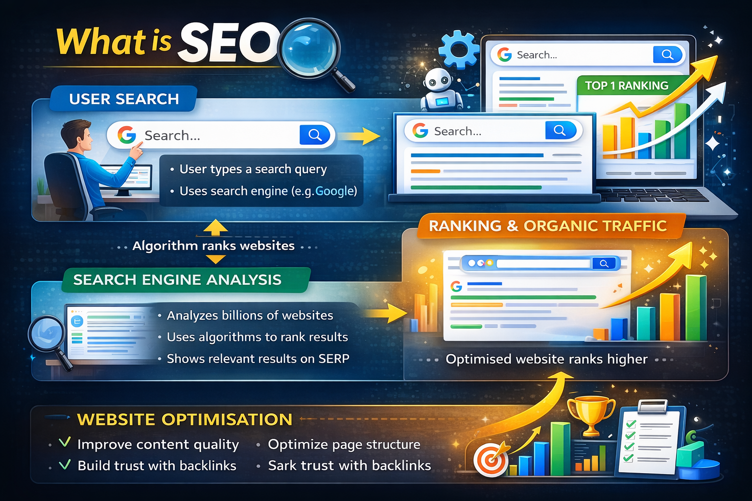 SEO focuses on making a website easier for search engines to understand. Search engines use complex algorithms to analyse content, evaluate website quality, and determine which pages should appear in search results. SEO techniques align a website with these ranking factors.